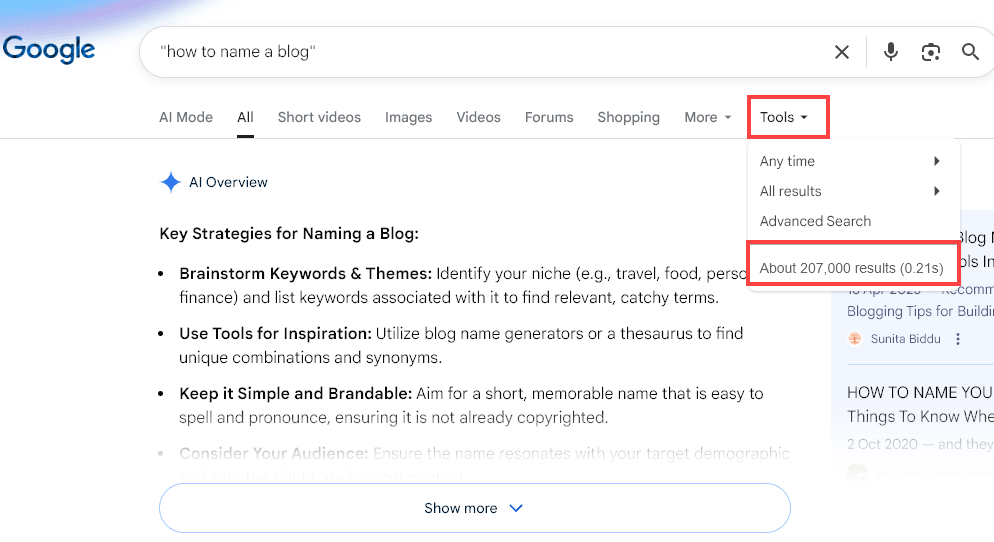 Google shows that there are over 6 billion search results for the word “blog.” Now, let’s see what happens if I use a more specific phrase like “how to name a blog”…